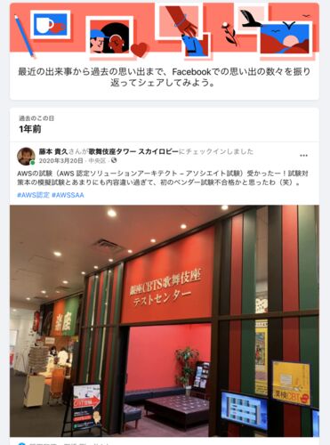 Facebook過去の思い出 Facebookの過去の思い出にこんなのが出て来た。3月20日で画面キャプチャーしてからちょい時間が経ったけれど。1年前かー。 Facebook過去の思い出(1年前、2020年3月20日の写真) TOKIOのベンダー試験受験の結果 「初のベンダー試験不合…